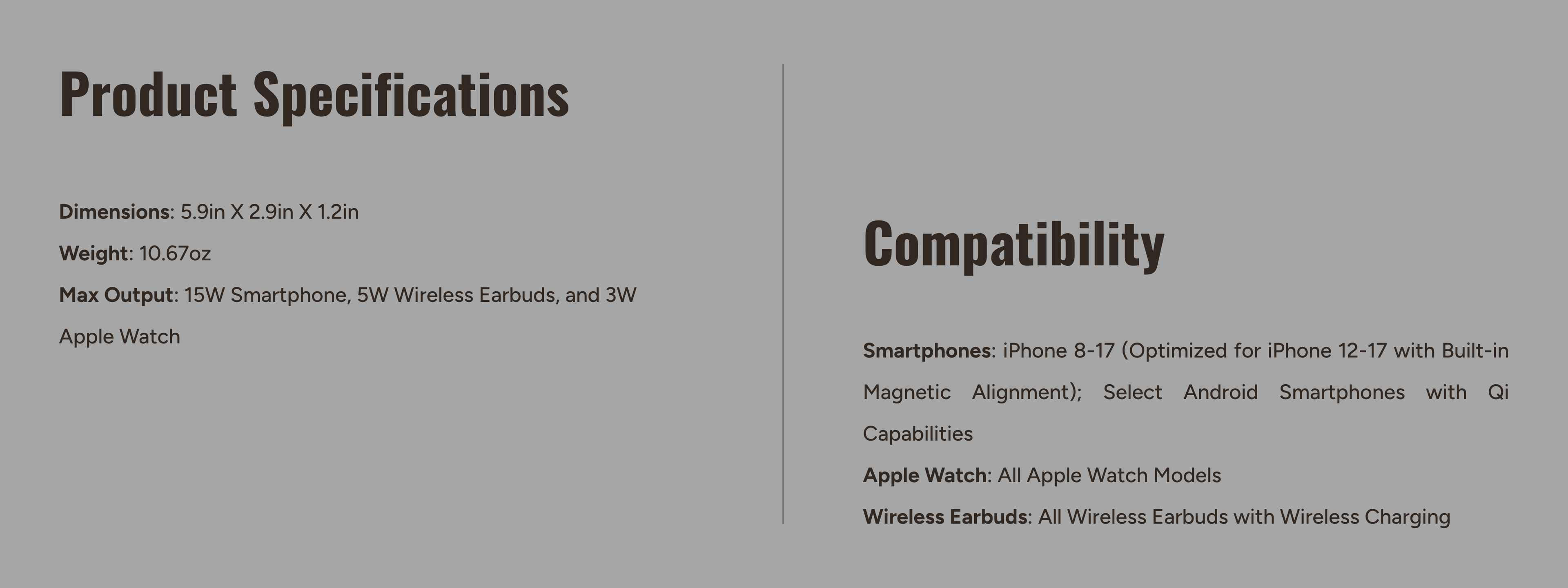 TrailCharge HUB delivers charging speeds of up to 15W for smartphone, 5W for wireless earbuds, and 3W for Apple Watch.