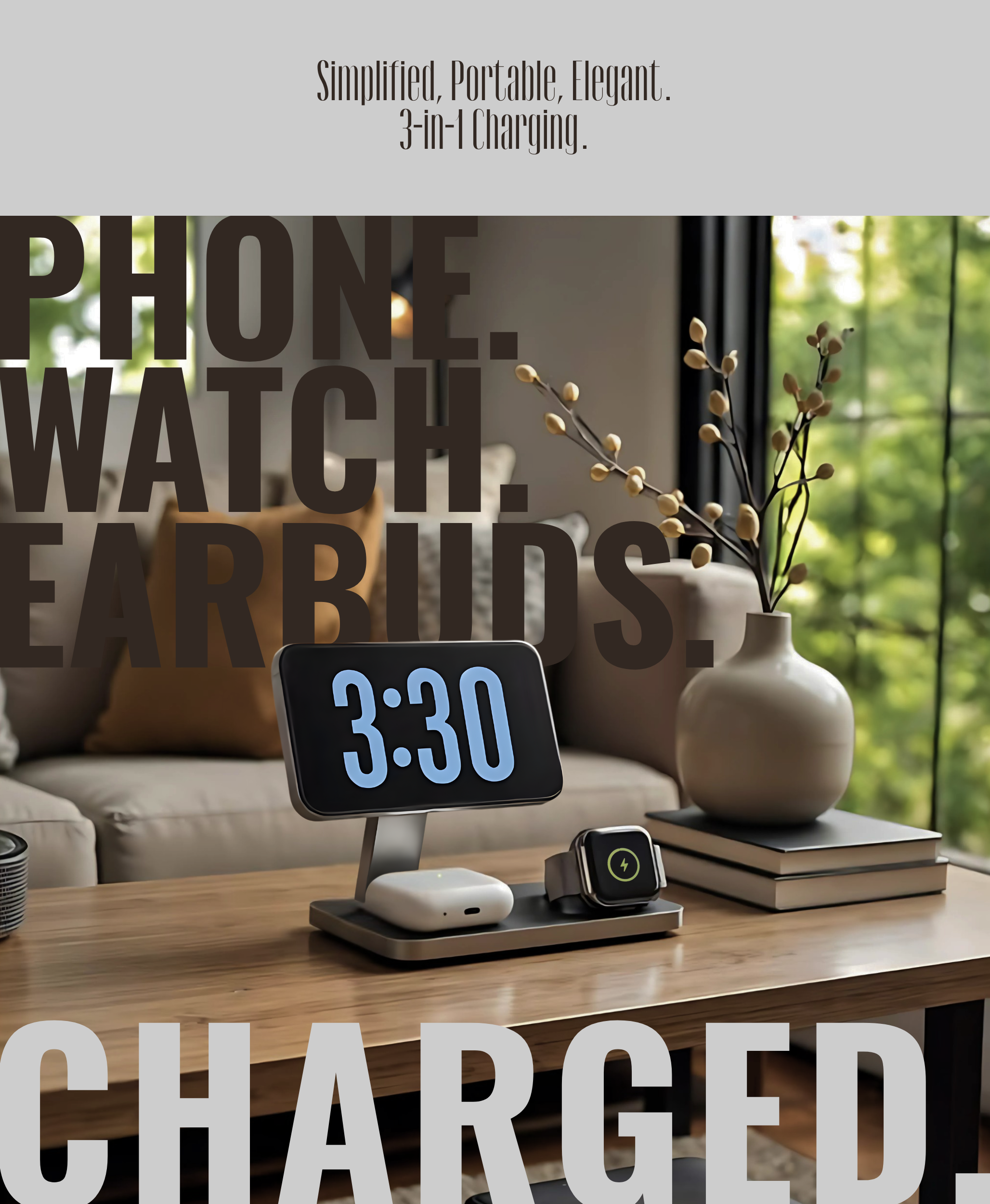 Snap your iPhone onto the magnetic pad, rest your Apple Watch on the stand, and set your AirPods on the base